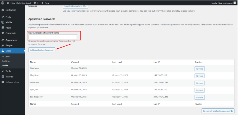 - Kéo xuống phần Application Passwords (hoặc mục có tên tương tự).