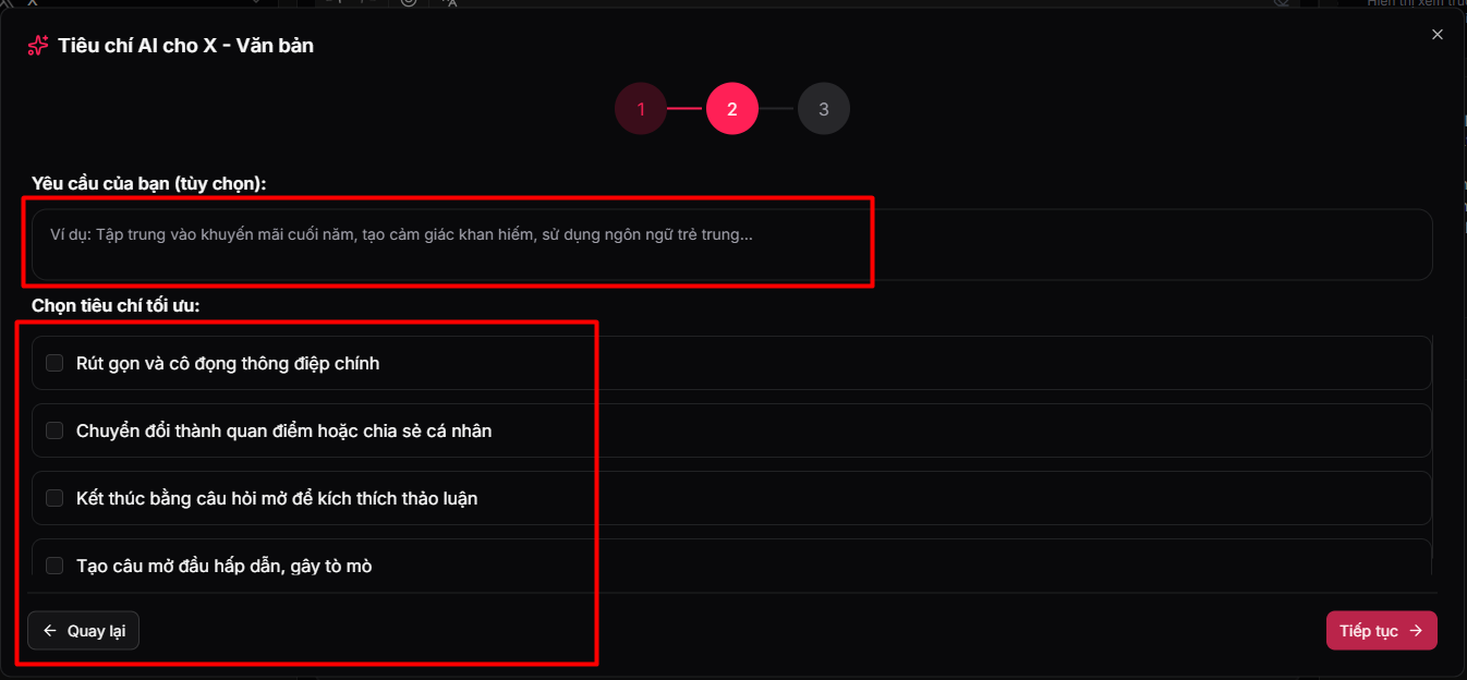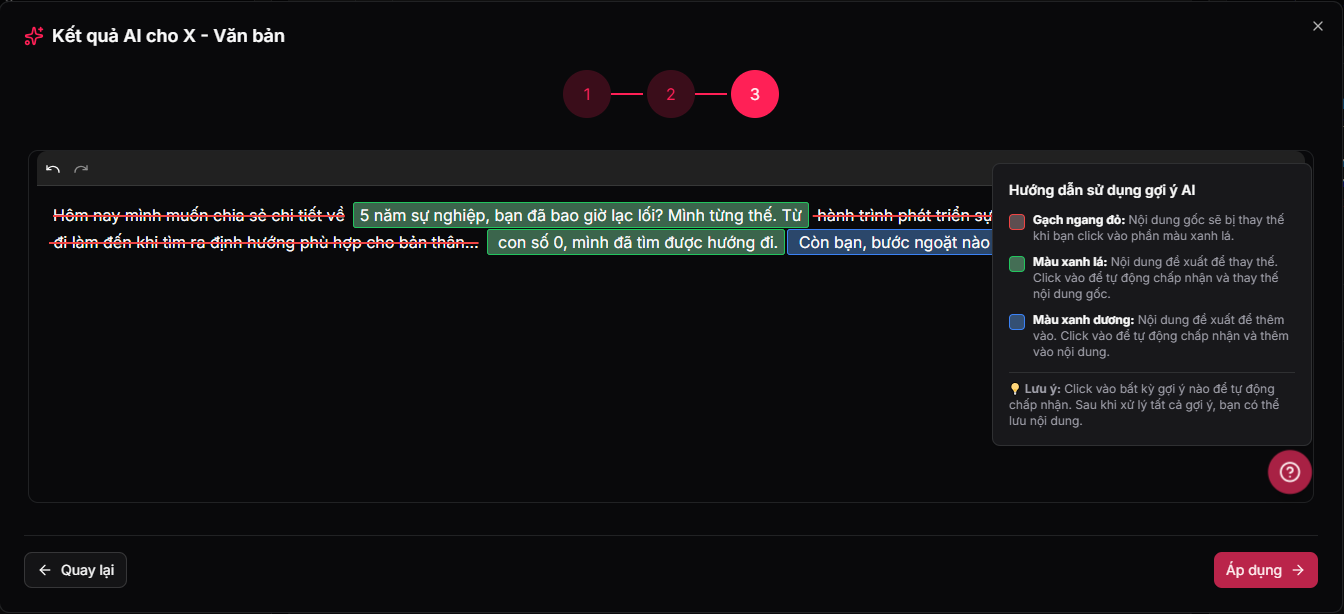 Tiếp theo, bạn có thể nhập yêu cầu riêng hoặc chọn các tiêu chí gợi ý để cá nhân hóa kết quả. Sau khi tiếp tục, AI sẽ trả về bản chỉnh sửa với các đánh dấu trực quan.