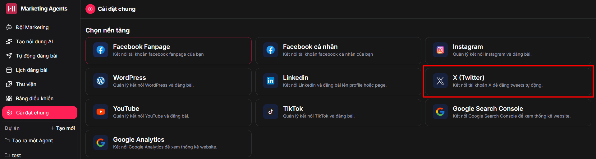 Ở màn hình chính của Marketing Agents, chọn Cài đặt chung và chọn X (Twitter).